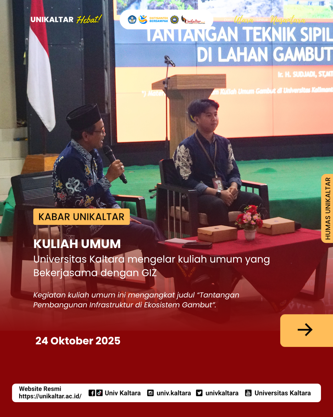 Jumat, 24 Oktober 2025. Universitas Kaltara mengelar kegiatan Kuliah Umum bersama GIZ (Deutsche Gesellschaft für Internationale Zusammenarbeit GmbH). Kegiatan tersebut juga ditujukan oleh Mahasiswa Universitas Kaltara dan Mahasiswa yang mengambil Mata Kuliah Pengantar Lingkungan Lahan Basah. Kegiatan kuliah umum ini mengangkat judul “Tantangan Pembangunan Infrastruktur di Ekosistem Gambut”.
