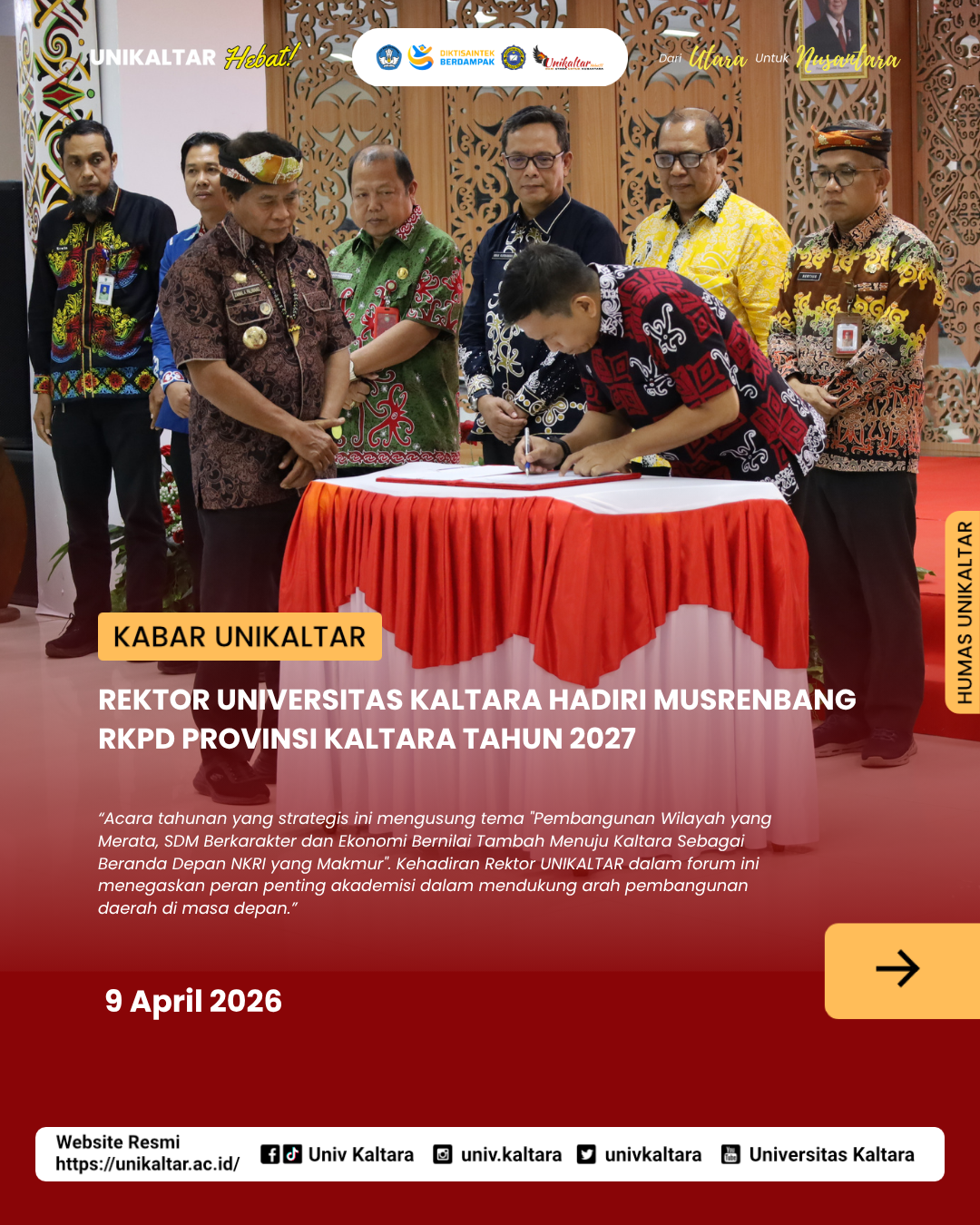 Tanjung Selor, Kamis 9 April 2026 – Rektor Universitas Kaltara (UNIKALTAR), Dr. Didi Adriansyah, S.TP., M.M., menghadiri pembukaan Musyawarah Perencanaan Pembangunan (Musrenbang) Rencana Kerja Pemerintah Daerah (RKPD) Provinsi Kalimantan Utara Tahun 2027. Kegiatan ini berlangsung di Ruang Serbaguna Gedung Gabungan Dinas Provinsi Kalimantan Utara pada Kamis, 9 April 2026.