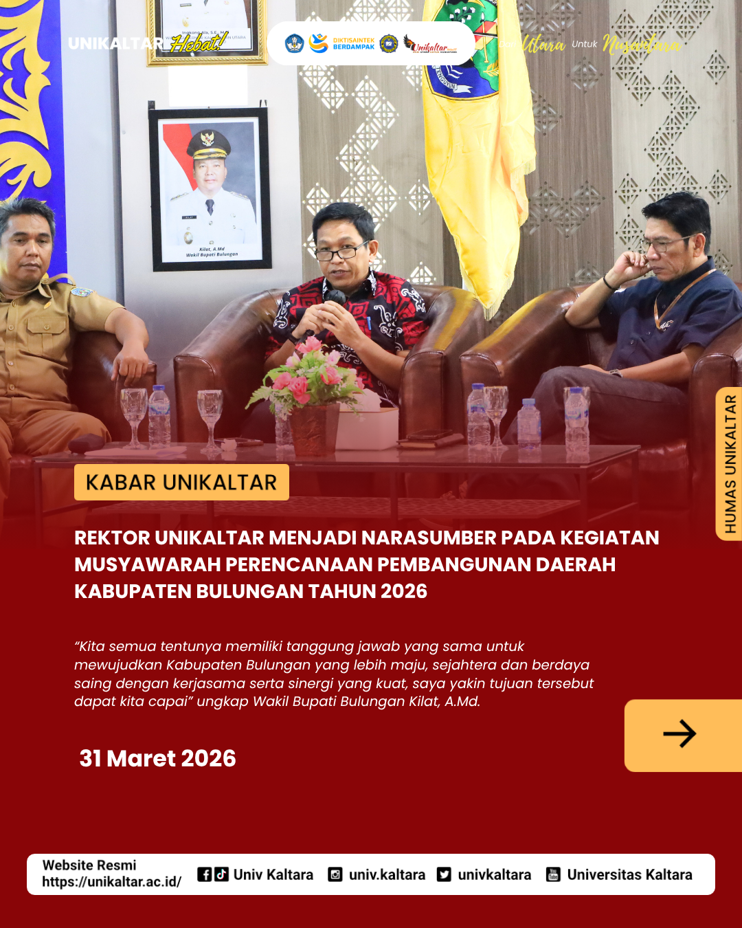 Rektor Unikaltar Menjadi Narasumber pada Kegiatan Musyawarah Perencanaan Pembangunan daerah Kabupaten Bulungan Tahun 2026 Bulungan, Selasa 31 Maret... Selengkapnya