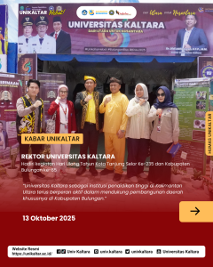 Tanjung Selor, 13 Oktober 2025 — Rektor Universitas Unikaltar, Dr. Didi Adriansyah, S.TP., M.M., turut menghadiri rangkaian kegiatan peringatan Hari Ulang Tahun Kota Tanjung Selor ke-235 dan Kabupaten Bulungan ke-65 yang digelar pada hari Senin, 13 Oktober 2025, bertempat di Kebun Raya Bundayati. Kegiatan ini merupakan penanda dibukanya pesta bud... Read More