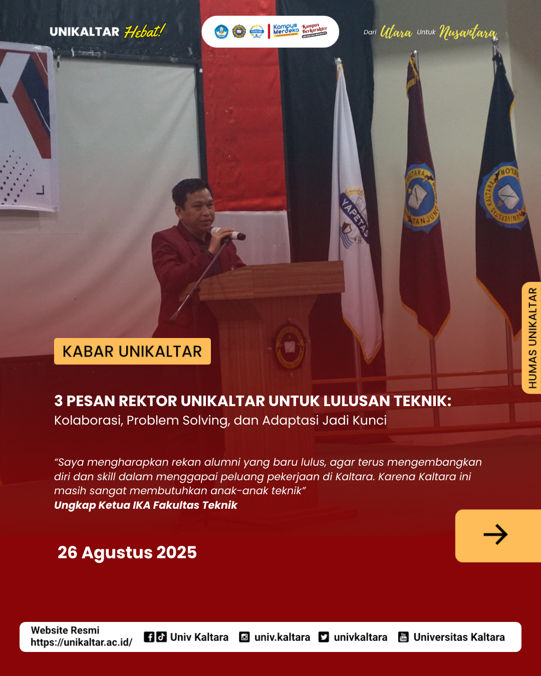 Dalam sambutannya, Rektor Unikaltar, Dr. Didi Adriansyah, S.TP., M.M., menyoroti tren positif yang terus meningkat pada Fakultas Teknik. Beliau berpesan kepada para lulusan untuk terus meningkatkan kompetensi yang telah diperoleh selama kuliah.