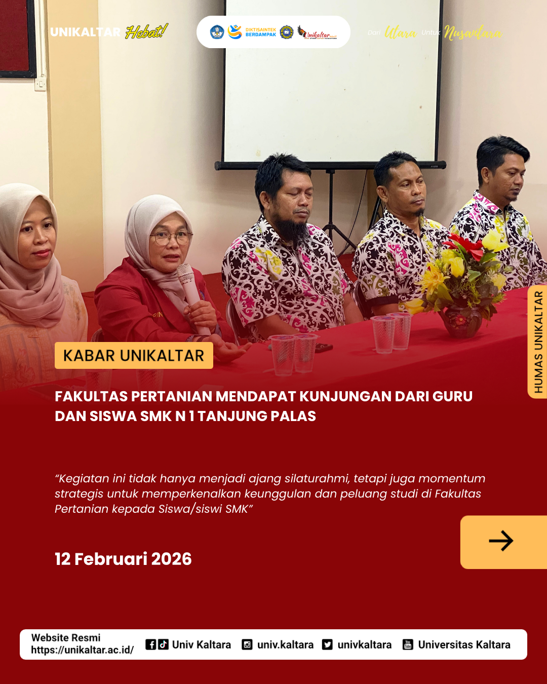 Fakultas Pertanian Universitas Kaltara (Unikaltar) mendapat kunjungan dari guru dan siswa SMK Negeri 1 Tanjung Palas jurusan Agribisnis Pengolahan Hasil Pertanian. Kegiatan ini dihadiri langsung oleh Dekan Fakultas Pertanian Rina Lesmana, S.P., M.M. dan Ketua Jurusan Agroteknologi Siti Masithah F., S.TP., M.Sc.