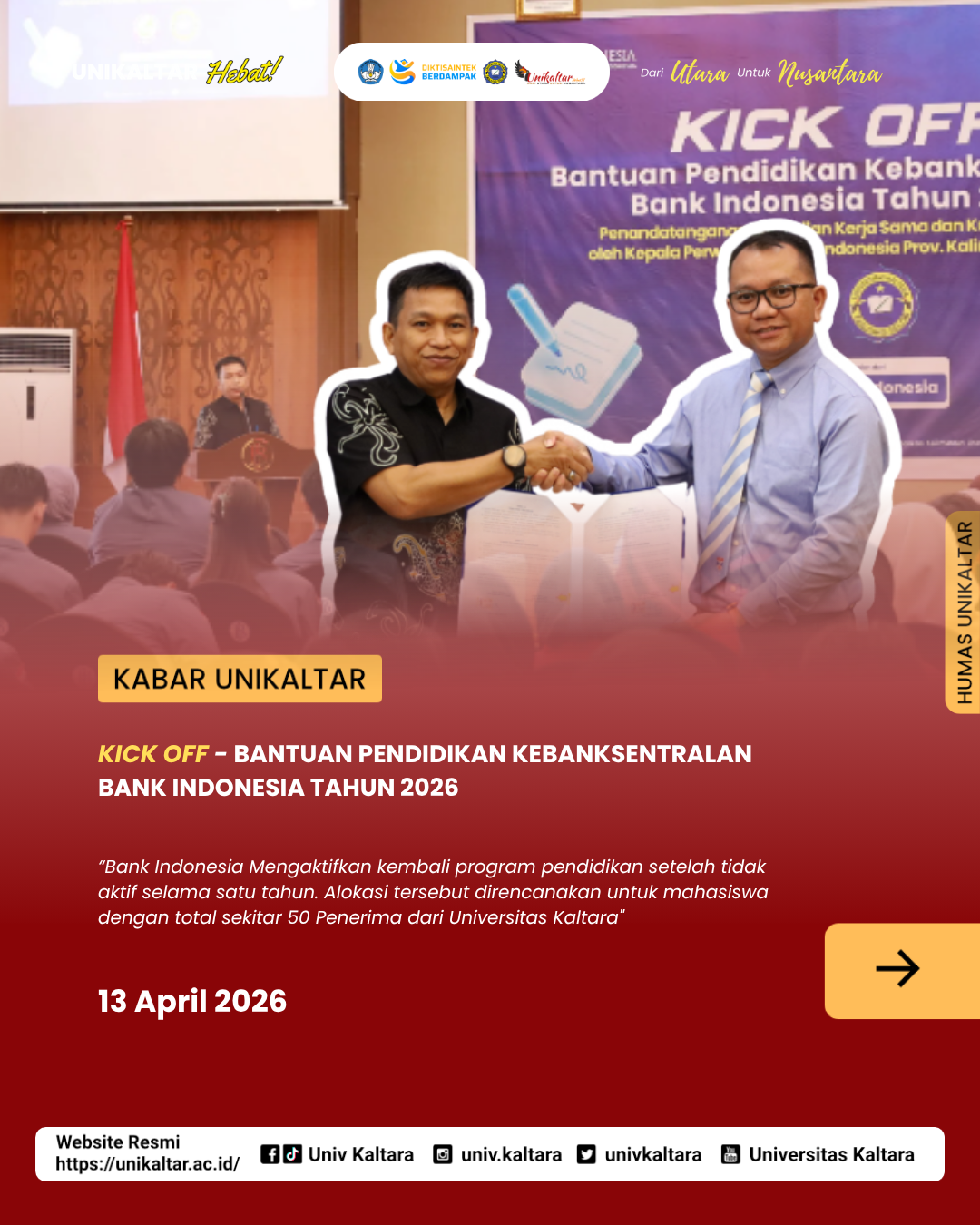 Tarakan, Senin 13 April 2026 - Rektor Universitas Kaltara (Unikaltar), Dr. Didi Adriansyah, S.TP., M.M., menghadiri kegiatan kick off bantuan pendidikan kebanksentralan Bank Indonesia Tahun 2026. Kegiatan tersebut dihadiri oleh sekitar 50 Mahasiswa Unikaltar bersama dengan staf kemahasiswaan Unikaltar.
