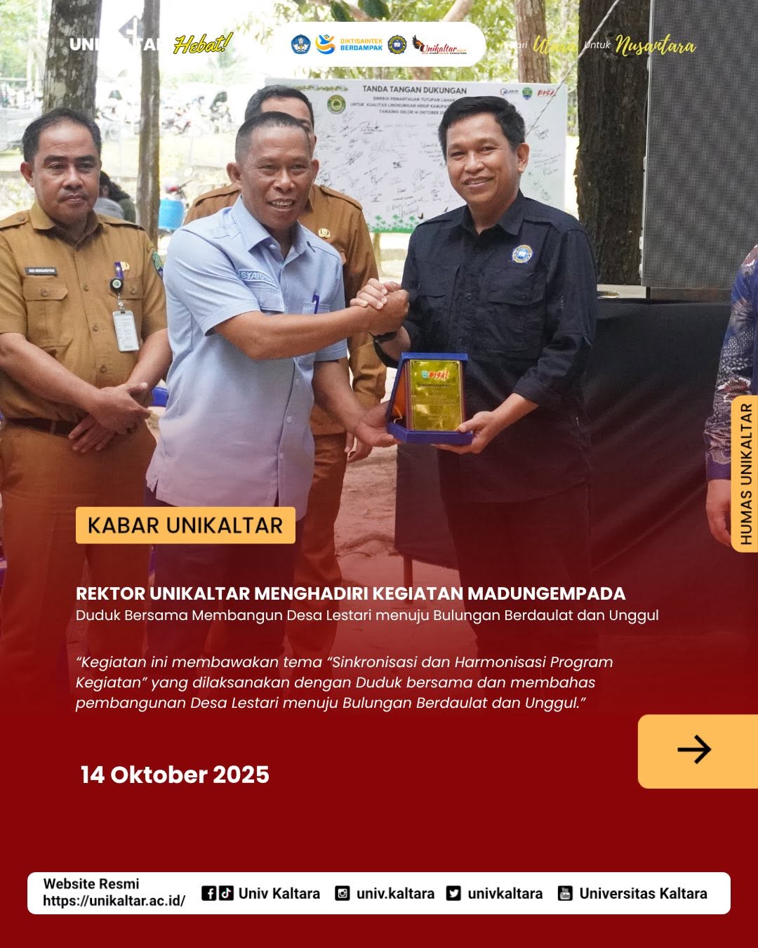 Selasa, 14 Oktober 2025 - Rektor Universitas Kaltara (Unikaltar) Dr. Didi Adriansyah, S.TP., M.M., menghadiri undangan pada kegiatan Madungempada yang didampingi oleh Wakil Rektor Bidang Akademik Ar. Sholehah, M.T., I.A.I., dan Kepala LP2M Eko Wahyudi, M.T. Kegiatan tersebut dilakasanakan di Taman Kota Kebun Raya Bundahayati dan mengundang berbagai NGO, Dinas terkait dan seluruh Kepala Desa yang berada di Lingkungan Kabupaten Bulungan.
